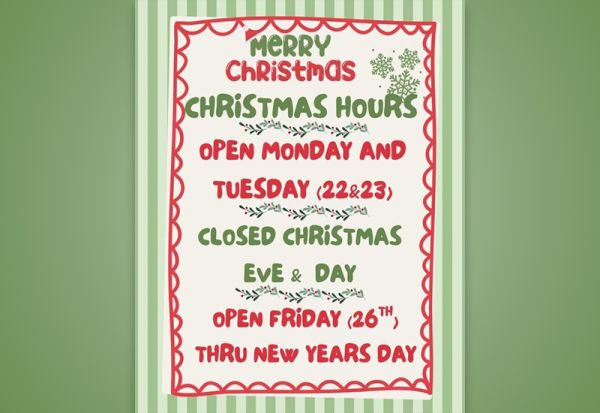 The Broken Candy Cane will be OPEN December 22nd & 23rd, CLOSED December 24th & 25th, and reopening for lunch on December 26th! Come celebrate the holidays with us!