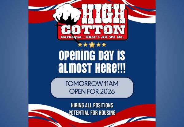 We're officially OPEN for the 2026 season! Come on by, say hi and grab all your High Cotton favorites. We're excited to be back and can't wait to see you!
