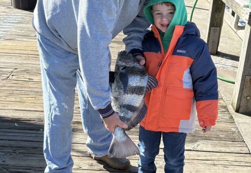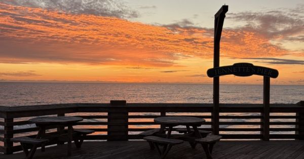 TBT -- Anglers are catching BLUES, SEA MULLET, PUFFERS and small SPECKLED TROUT. Ocean water temp 60 degrees, air temp low 55. Winds are NE at 14 knots. High tide 6:59 a.m. Low tide 1:36 p.m. A lone angler casts out at the old pier.