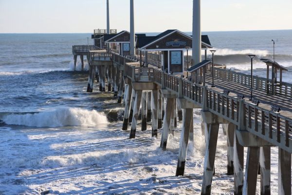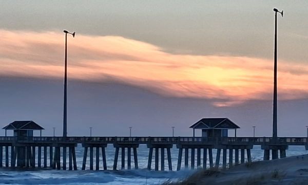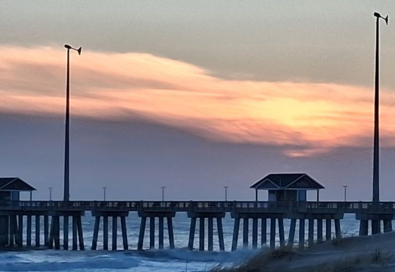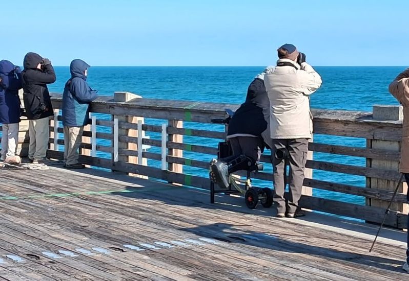 Half a dozen people are #bird watching from the end of the pier this morning. No one is #fishing but there are some solid swells rolling in. #Ocean temp 37 degrees, air temp 40 degrees. Winds are N at 8 knots. Low tide 9:58 a.m. High tide 3:40 p.m.