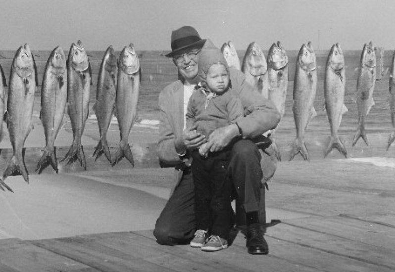 Throwback Thursday -- Quite a few anglers are giving it a go despite the strong, 22 knots NE breeze rolling in, kicking up the surf. So far, RED DRUM and BLUEFISH. Water temp 72 degrees, High tide 9:26 a.m. and 9:49 p.m. Low tide 3:59 p.m. Today's blast from the past photo shows a well dressed man with a boy and mess of large BLUEFISH.