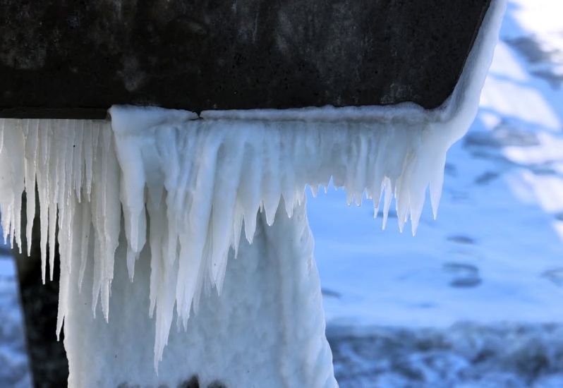 Icy Out -- Check out the large #swell crashing in past the pier and the #ice formed on the northeaster sides of the pilings! There are even icicles hanging down! Air temp 27 degrees and #ocean water temp 34 degrees. Winds are NW at 11 knots. Low tide 8 a.m. High tide 1:27 p.m.