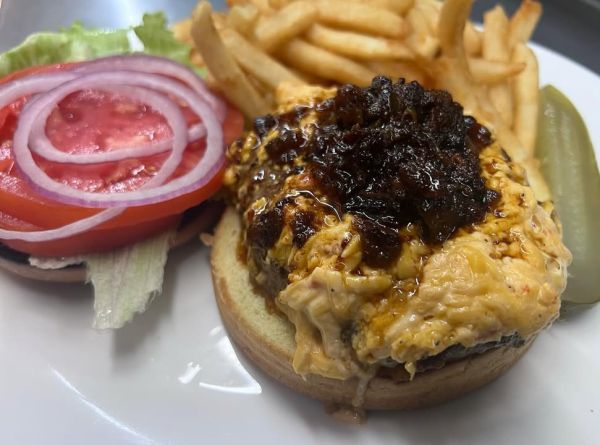 Burger Night!! Hop in and give this Pimento Cheese Burger topped with our Housemade Bacon Jam a try! Swipe to see all the other Burgers & Dinner Specials #waterfrontdining #burgernight
