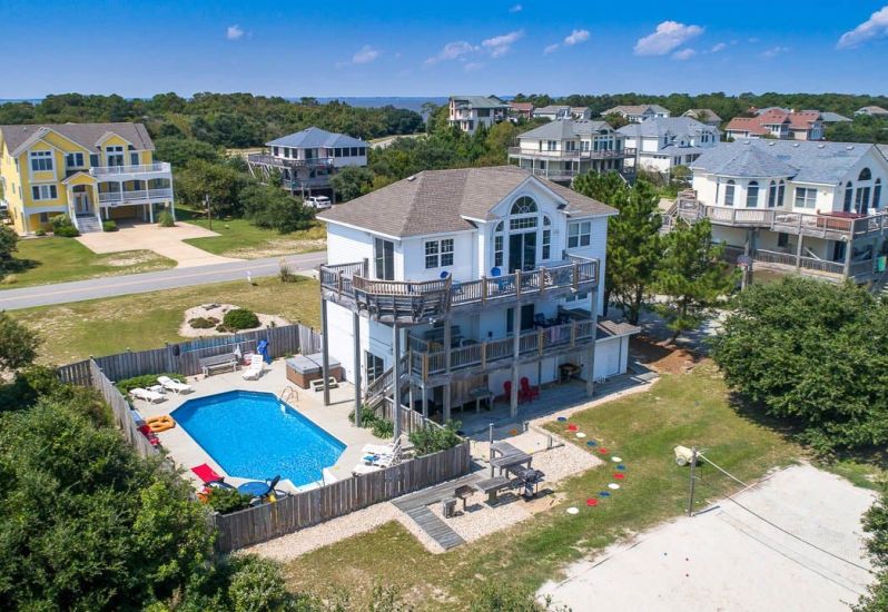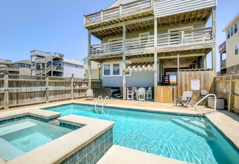 Just For Fun is a 5 bedroom, semi-oceanfront, dog-friendly home in South Nags Head that offers a heated private pool, elevator, hot tub, pool table, and more. Guests noted that the home well designed for large families, it was very clean, and the walk to the beach was easy and convenient!✨