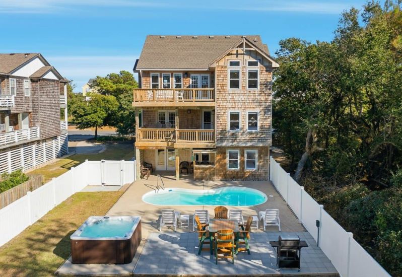 Just For Fun is a 5 bedroom, semi-oceanfront, dog-friendly home in South Nags Head that offers a heated private pool, elevator, hot tub, pool table, and more. Guests noted that the home well designed for large families, it was very clean, and the walk to the beach was easy and convenient!✨