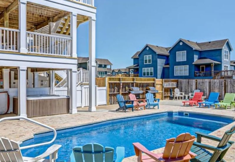 Shoreview Manor is a brand-new, semi-oceanfront 4-bedroom home featuring en suite bathrooms, a mid-level main living area, and an open kitchen, dining, and living space that leads to an ocean-facing deck—perfect for enjoying morning coffee with a view. Just 35 feet from the beach near Kitty Hawk’s popular Byrd Street surf break, the home offers easy access to the pier, shopping, and local golf, making it an ideal spot for a relaxing Outer Banks getaway. We’re excited for construction to be completed so guests can enjoy the private pool, hot tub, outdoor wet bar, 2025 beach gear credit, and all the modern amenities designed for convenience and comfort!✨