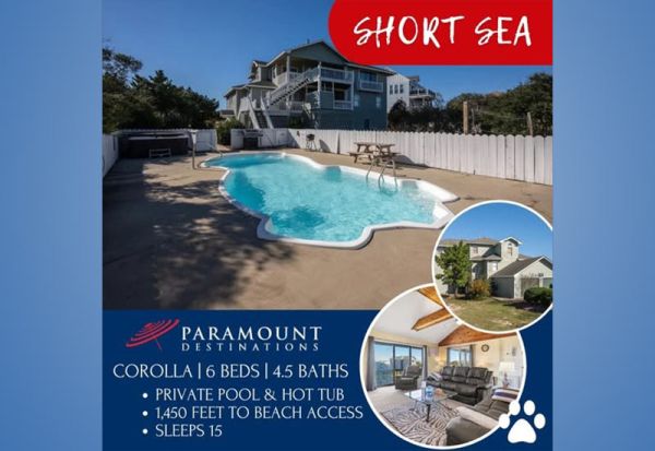 🌊 If you haven't already made your 2026 OBX vacation plans, now is the time. Short Sea is a spacious and conveniently located rental in Corolla with six bedrooms and room for up to 15 guests. This pet-friendly home also has a private pool and is only a few steps from the nearest beach... See More