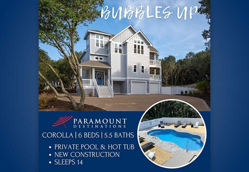 🫧 Bubbles Up is a new construction vacation rental with a private pool, hot tub, four master bedrooms, and access to Currituck Club amenities. This home accommodates 14 guests and is absolutely stunning. Be sure to book early for the best availability.