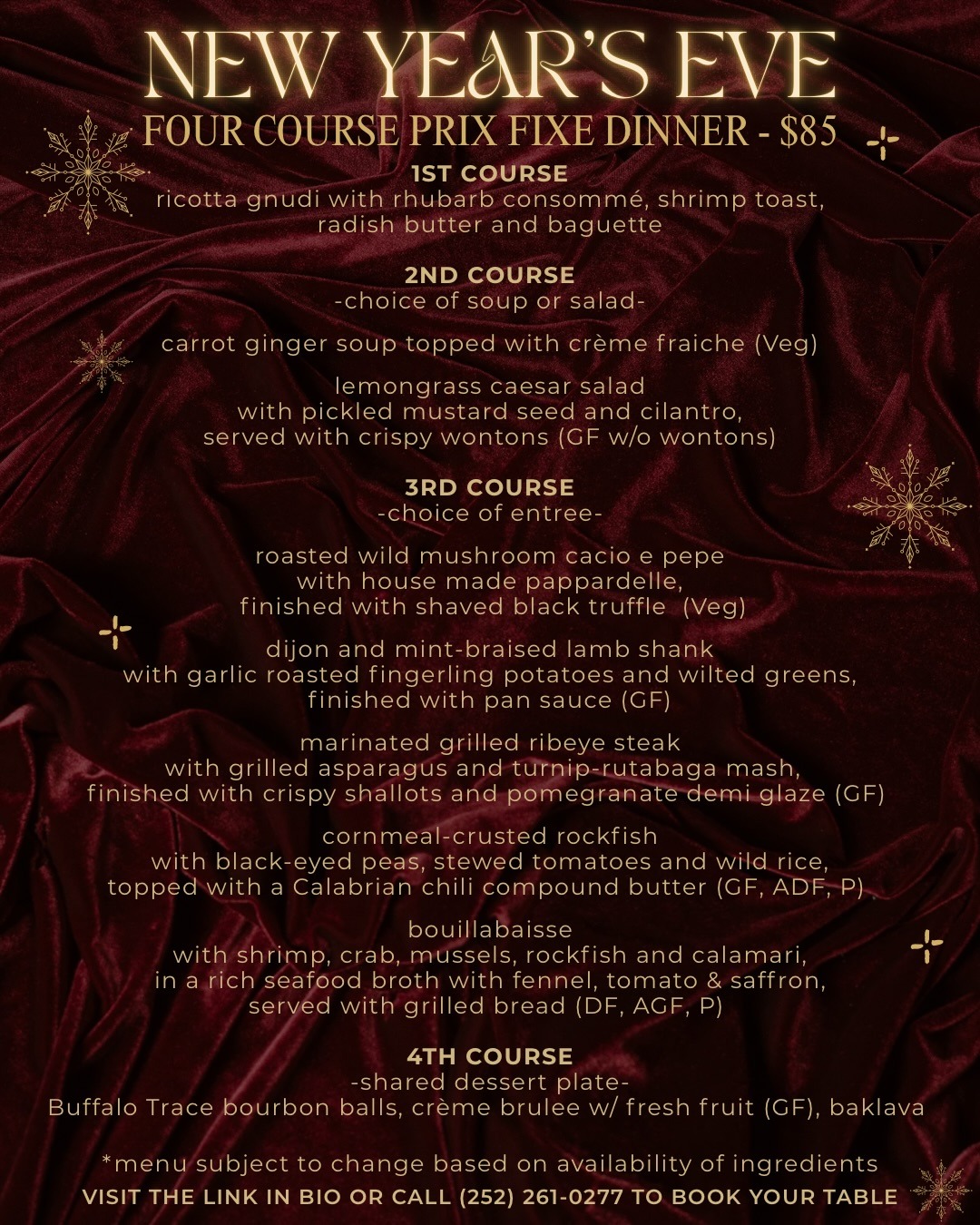 For the most up-to-date menus, please visit our website using the links below: Food Menu Wine List Cocktail & Mocktail Menu List of Rotating Beers on Tap New Year's Eve MenuClick thumbnail to view menu.