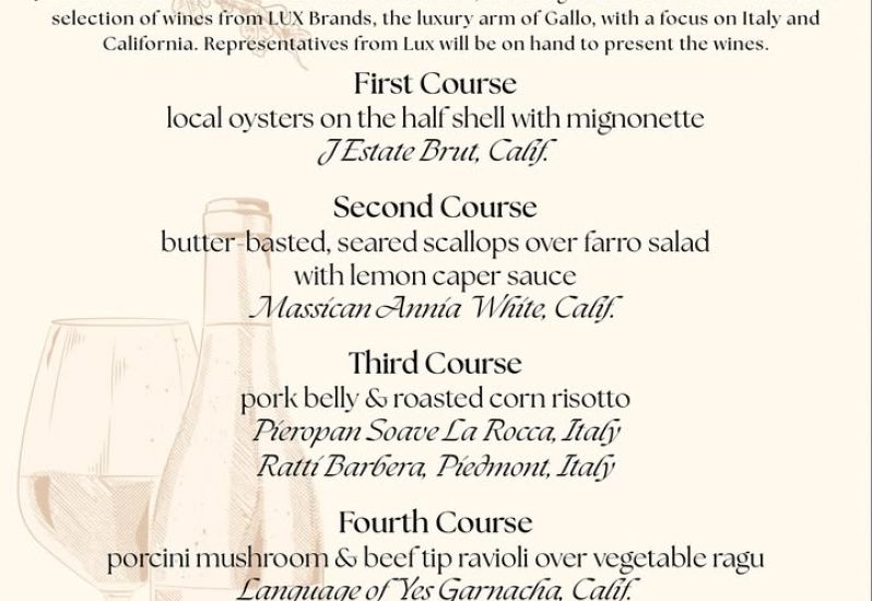 Our second wine dinner of the season is next Tuesday, November 18th at 6pm! Chef Neil and his team will prepare 5 courses to pair with a selection of domestic and international wines from LUX brands. Call to reserve!