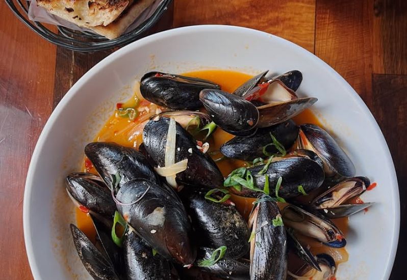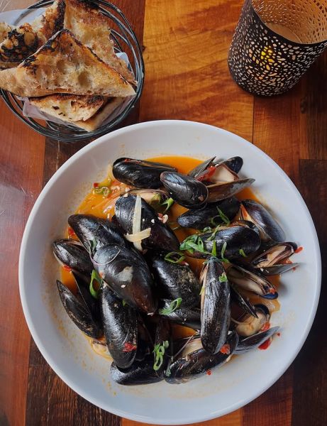 PEI Mussels are back for a limited time! Bathed in a garlicky white wine and Calabrian chile broth and served with grilled bread. This dish is almost too pretty to eat!