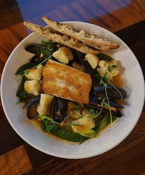 with mussels, snap peas, and cauliflower poached in a seafood broth and severed with roasted garlic potato gnocchi