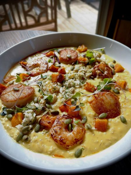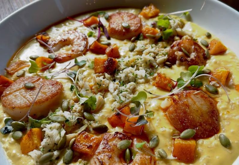 A perfect dish for today: Autumn Seafood Risotto - acorn squash cream risotto with roasted butternut squash, seared local scallops, grilled shrimp, and crab meat topped with pepitas and turmeric butter